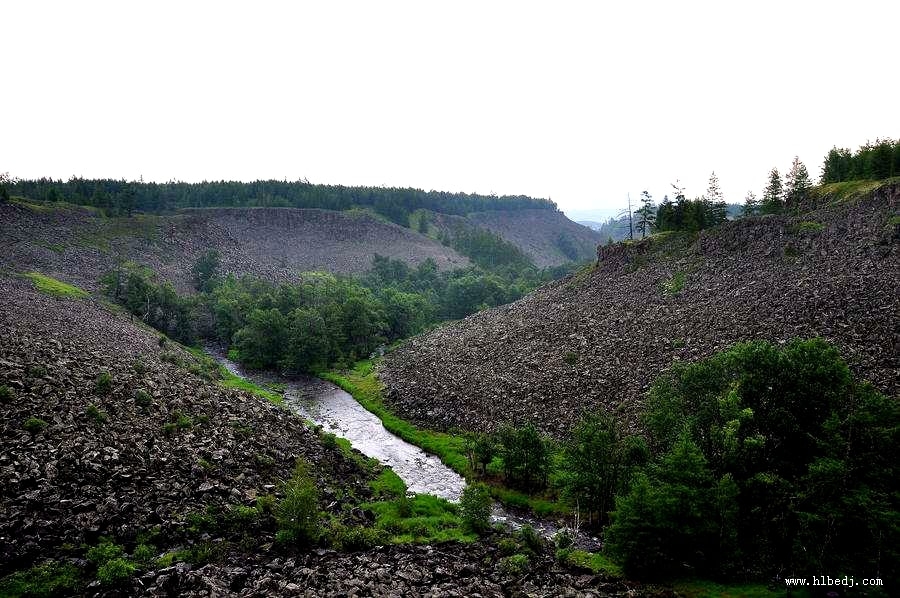 公園內(nèi)的地貌屬于大興安嶺西側(cè)火山熔巖地貌,由于火山噴發(fā)熔巖壅塞及水流切割,造成一系列有鑲嵌性質(zhì)的截頭錐火山,例如:天池、馬蹄形熔渣火山錐(摩天嶺),熔巖湖(達(dá)爾濱湖)和熔巖盆地(興安石塘),形成特殊的地貌景觀,山脊緩和,山頂多石質(zhì)裸露,坡面較為平緩,坡面較短,坡谷大多平坦而寬闊,屬典型的中山山地地貌,以花崗巖為主,地下礦藏有石灰石、大理石分布。
